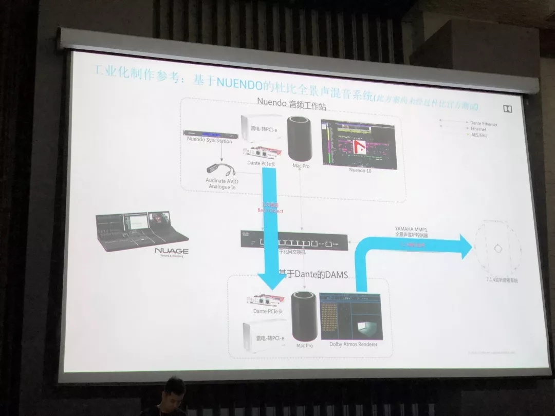 研讨会使用Yamaha Nuage Dante AIC128-D加速卡做为主控系统,Yamaha Nio-500 A16作为主音频接口,Yamaha MMP1作为全景声监听控制器,并使用Yamaha HS7+HS5+HS8S监听音箱组成杜比5.1.4全景声声场。