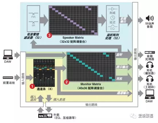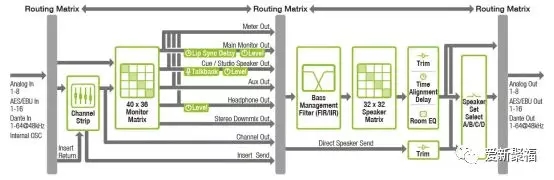 看完上述的介绍,大家可能会有一些困扰,觉得功能的确很强大,但比较复杂,其实不然,设置几乎是“傻瓜式”的,在刚开始会让建立一个预制,一步一步的都会提示您设置好,设置好之后保存起来,就可以一直用啦!了解完大概的功能介绍,再来看一下我们整个MMP1的信号流程,其实和大多数监听控制器是一样的,只不过他的矩阵帮了很大的忙。