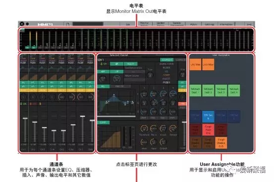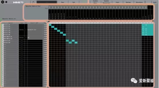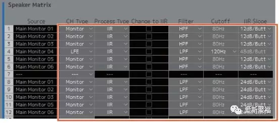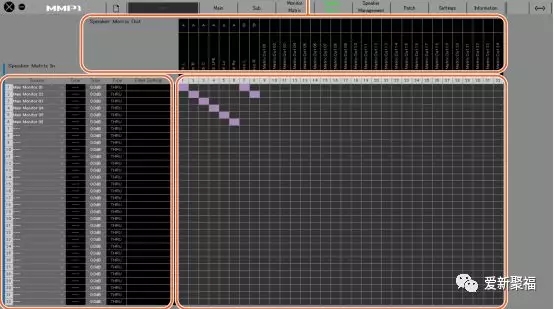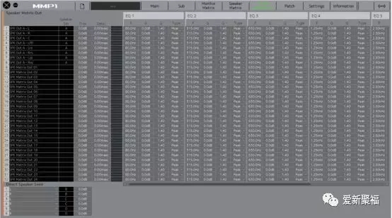MMP1的Speaker音箱矩阵,每个通道都配有EQ调节,调整每个音箱在声场准确性,并且可以去调整整套监听系统的延迟,保证混音的时间精确性。