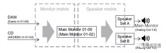 其实就是从Monitor矩阵出来的各组信号,有的进入印象分配矩阵,有的直接输出用了,简化一点其实就是这个样子(这个是5.1+立体声监听的一个小例子):