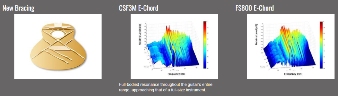 CSF系列的设计使用了全新的音梁结构,带来和全尺寸吉他一样的丰富饱满的音色。靠前部的结构可以保证琴体的强度,同时最大化吉他面板的振动。