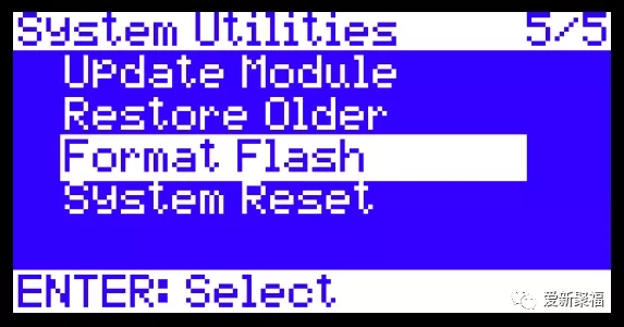 翻到5/5页到达System Utilities页面,用转盘移动光标选择第三项Format Flash,按Enter键确认