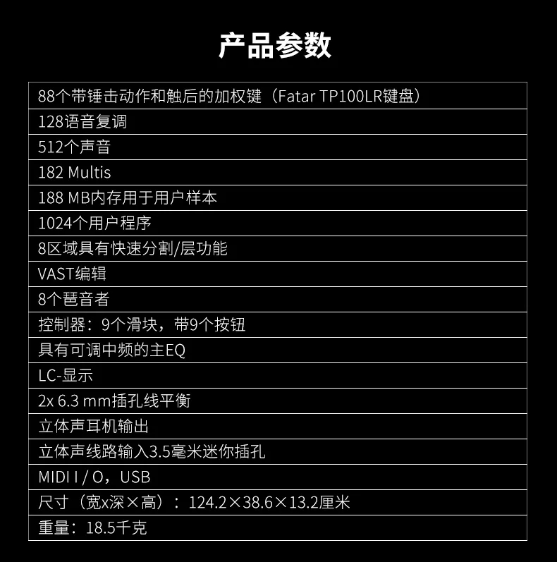 Kurzweil Forte SE包含从古到今Kurzweil所有的采样, 从最为知名的管弦乐到最新的8层力度分层的钢琴音色,能胜任所有风格的演奏。大量的实时控制器,舒适的FATAR键盘手感,优秀的钢琴音色!它还包含完整的VAST音色编辑系统,让你创造无限可能!