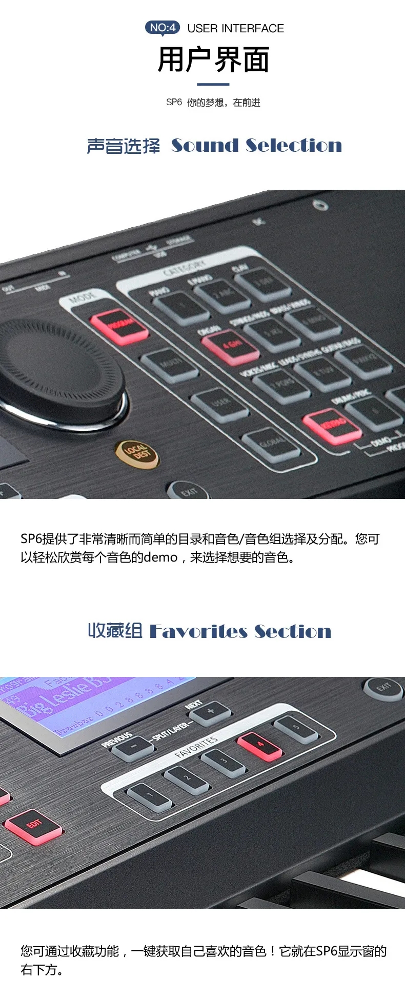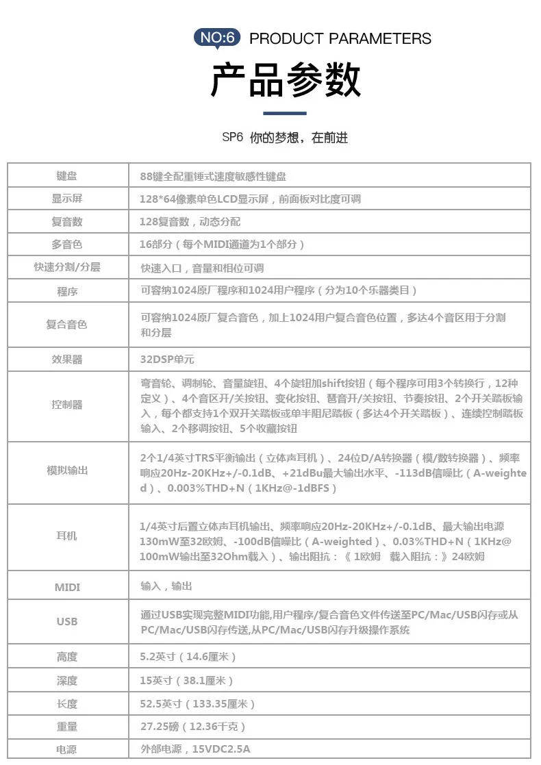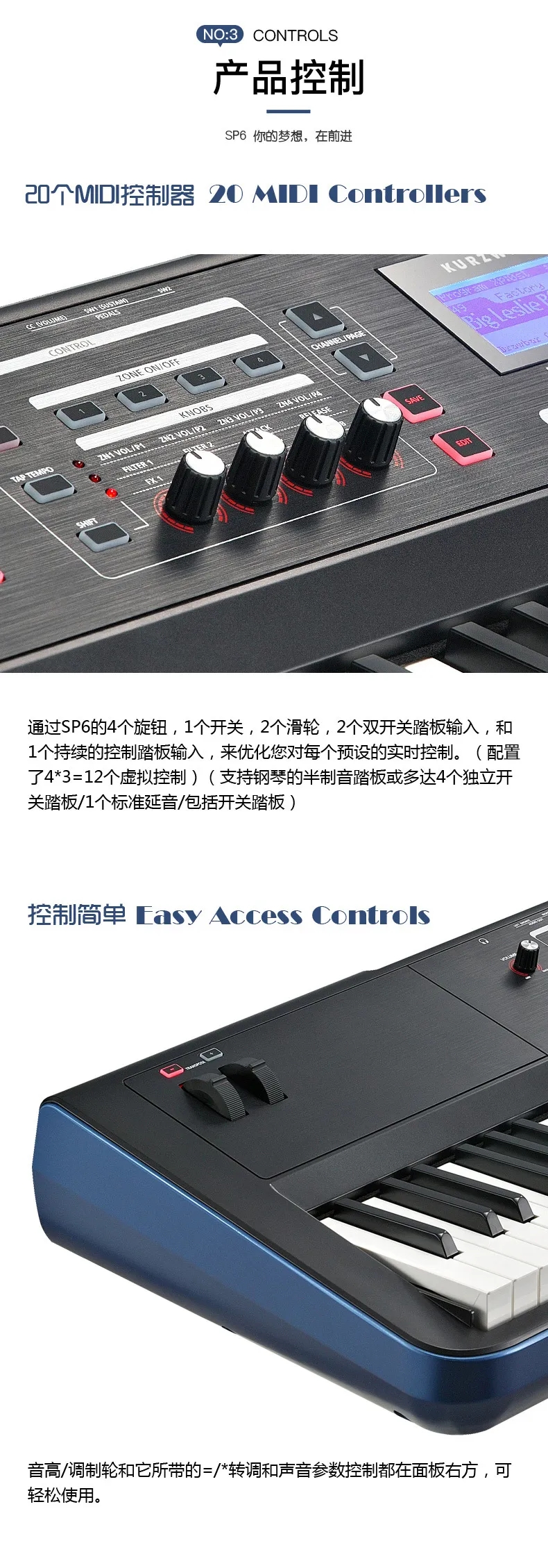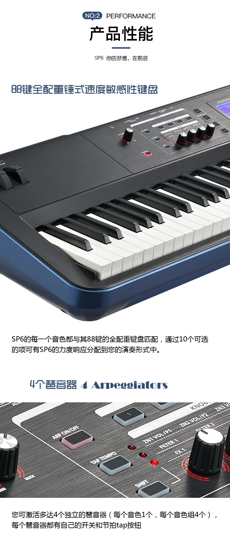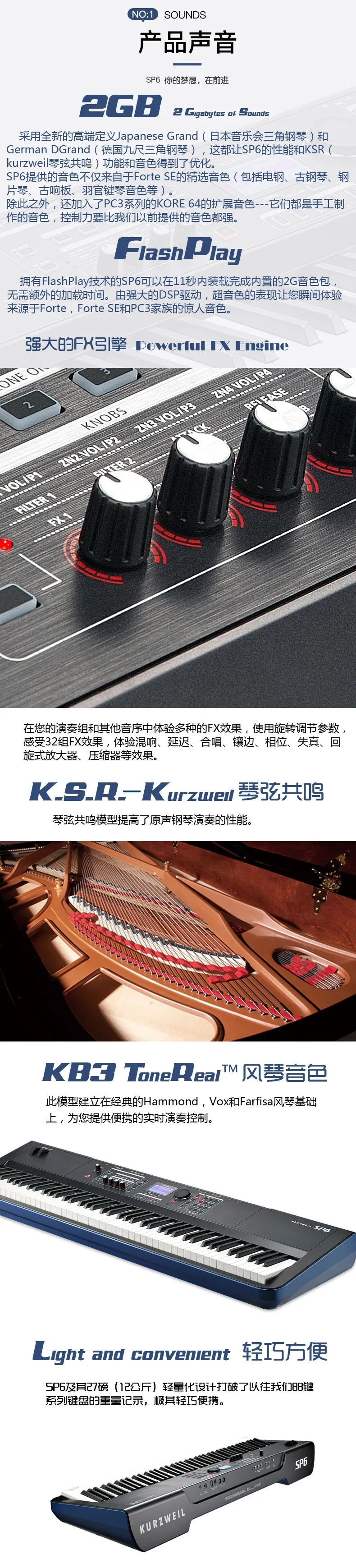 P6 LENA处理器、专利的FlashPlay技术、128复音和强大的DSP等功能融入到了一个高度便携的(12.36kg)舞台钢琴中,专为表演艺术家和工作室音乐人而设计。它的88个琴键提供了声学三角钢琴的全配重锤动感觉,具有由“K.S.R.-Kurzweil String Resonance(Kurzweil琴弦共鸣)”增强的高清晰的钢琴音色。它的KB3 ToneReal™ Organs仿真了经典的Hammond、Vox和Farfisa,具有实时的表现控制。SP6带有10种类型256个原厂音色,具有1024个用户音色空间。