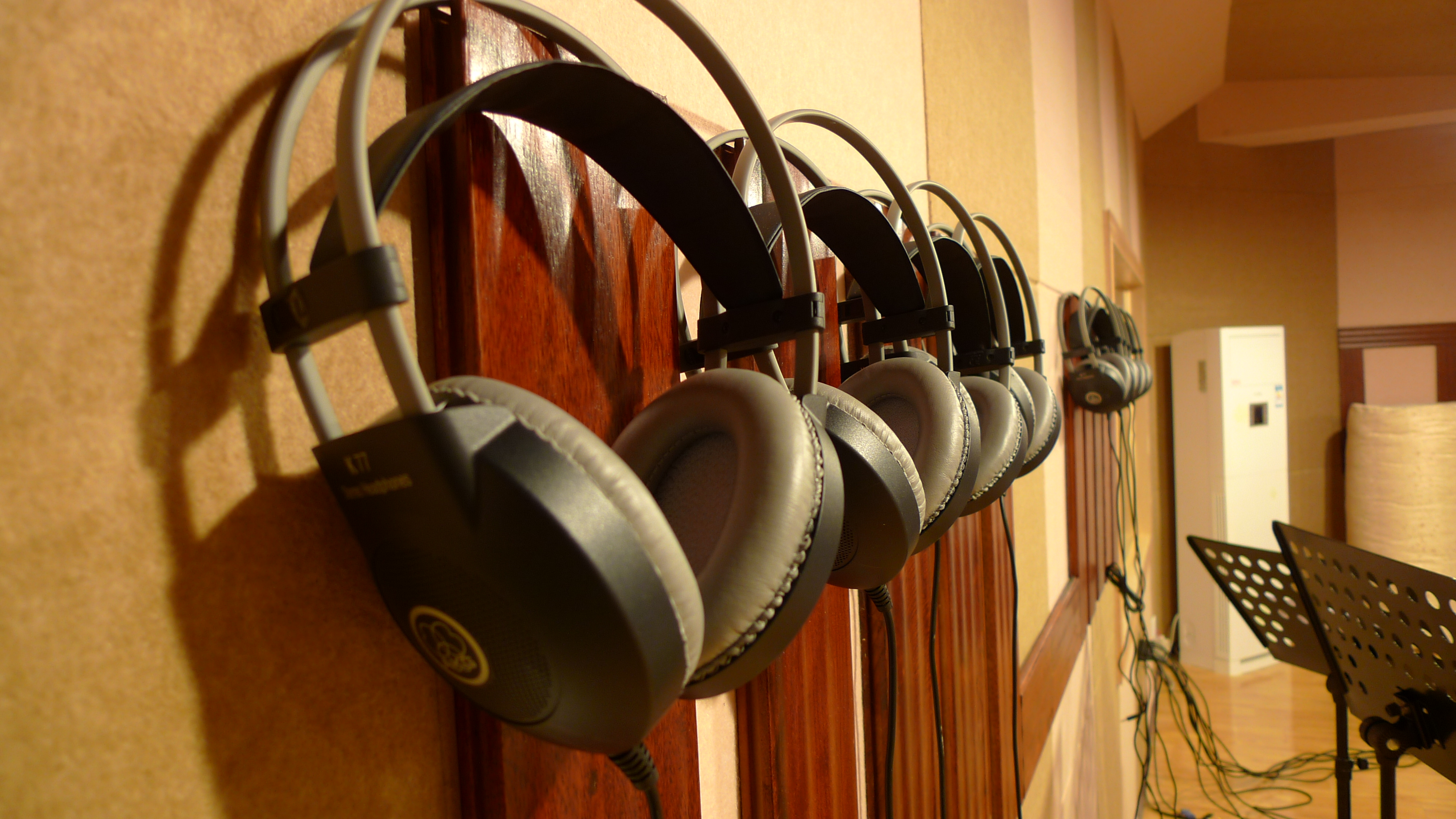歌手监听使用的AKG的K77高品质监听耳机和REBORN的HA2600专业耳机分配器。