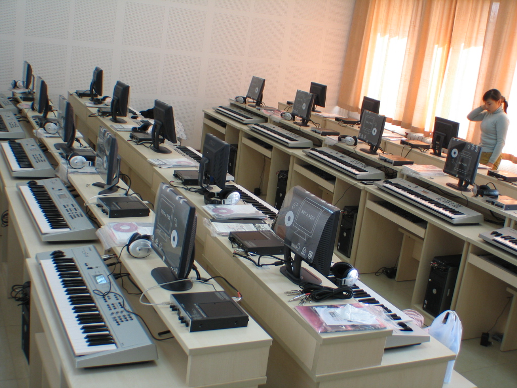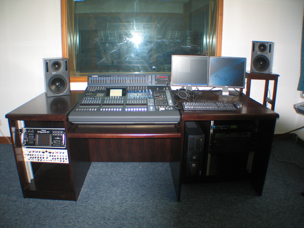 此系统使用YAMAHA DM2000V2数字调音台为主核心。所实现的功能有:与工作站软件进行同步遥控,同时24路模拟输入录音,64通道的硬件混音。方便的调音台对讲功能等等。