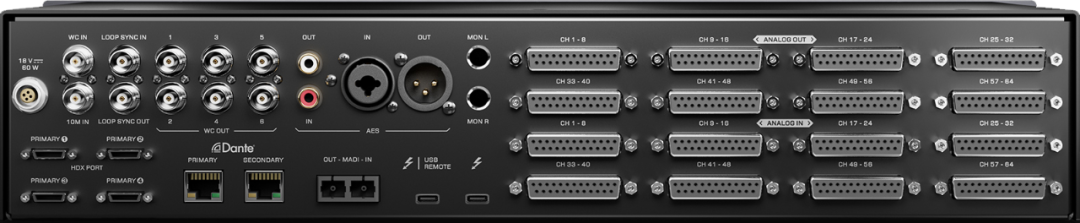 • 4个HDX端口:多达128通道的24bit/192kHz音频传输,用于连接Pro Tools系统;