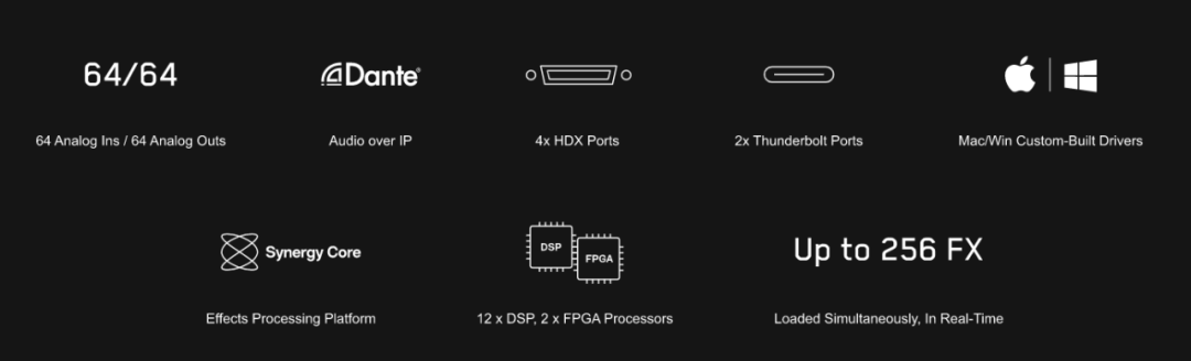 Galaxy 64 Synergy Core是唯一一款能够同时提供2个Dante™网络端口、4个HDX端口(在Pro Tools中提供完整的128通道192kHz音频)以及2个Thunderbolt™端口的音频接口。它能够使用多个端口与多个系统同时连接,以轻松适应不同DAW和各种工作流程,而这一切都可凭借Antelope独有的FPGA组件和数字路由矩阵来快速实现。