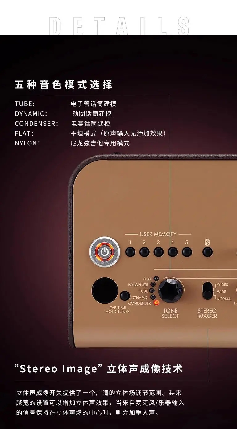 包括电容麦克风,动圈麦克风,电子管麦克风建模让你的吉他声像是在录音室录制的效果一样。还有尼龙弦吉他专用模式和用于连接其他乐器的平直模式。