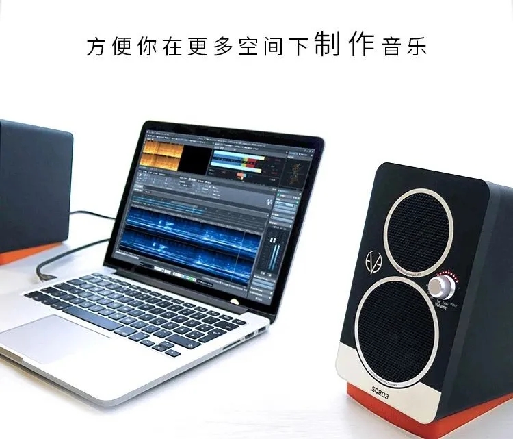 夏娃小型桌面监听音箱SC203可以提供卓越的声音品质,当空间有限时它变得非常实用。它有着3寸的低音喇叭,机身的高度大约是7寸多一点,可以和笔记本电脑一起放进普通的背包里,这样就形成了一个真正的移动式录音室。