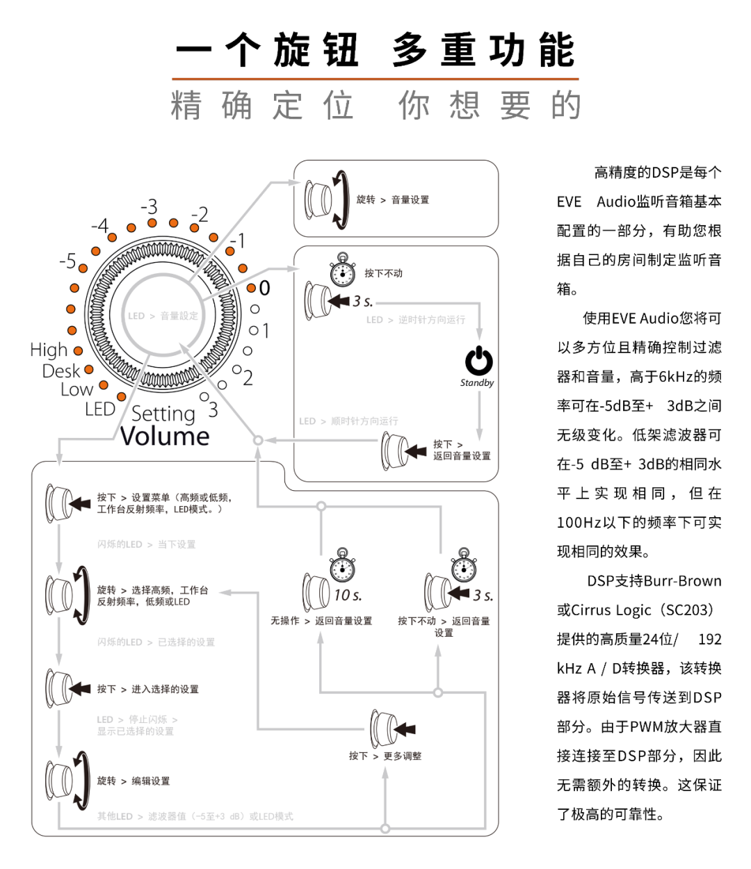 在主喇叭的前侧有夏娃的一键DSP旋钮。这个设计非常方便,一个旋钮加可按压键的设计将高频、低频、音量、输入模式等等功能全部包括在内,让用户操作更为简便。