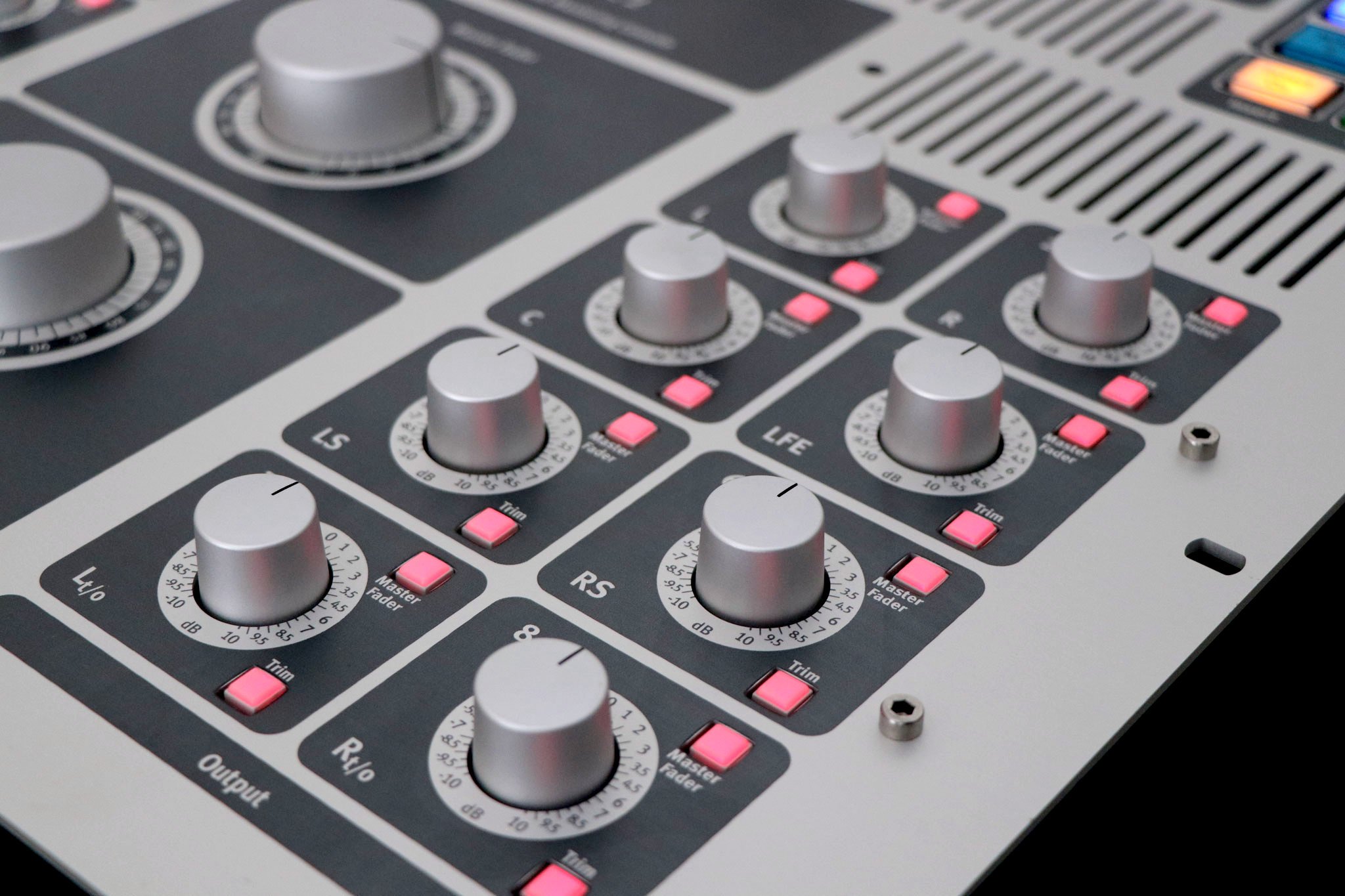 两个立体声对以及两个环绕音箱组可以用于进行输出监听,通过按钮推进,可以选择3种不同的渐弱电平以及哑音电平。