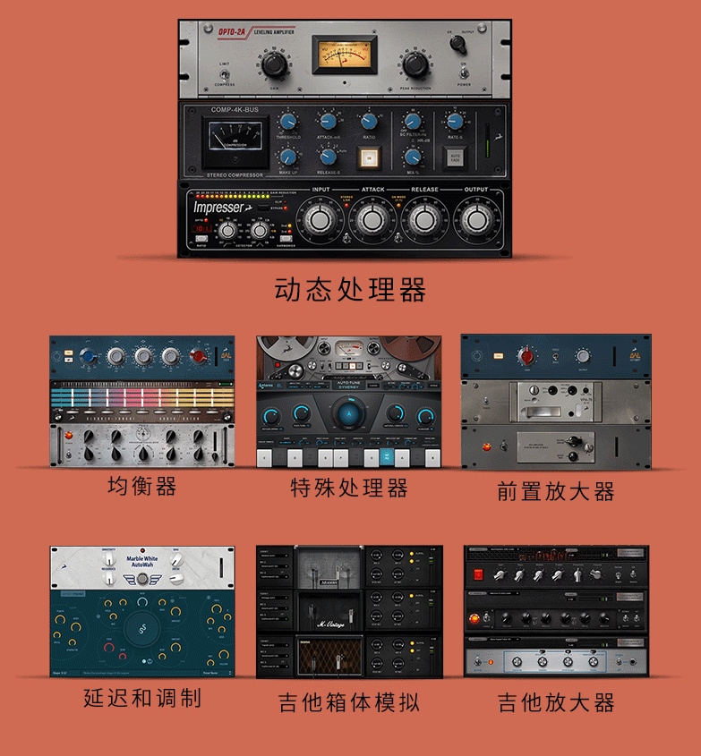 精心挑选37款出色的模拟建模效果器,创作出饱满而震撼的作品。除压缩器、均衡和话放以外,还附带22个吉他放大器和箱体模拟,颇具混响效果,可应用于录音和混音当中进行直接监听的同时将多种效果器加入您的效果链,不用担心CPU过载。