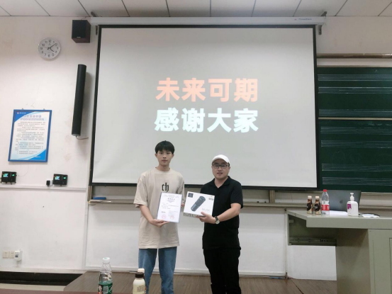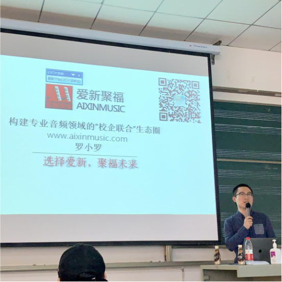 由我司项目经理罗超主讲,题为《浅谈爱新聚福构建专业音频领域的“校企联合”生态圈》,该讲座剖析了专业音频领域的校企关系及合作前景,得到师生的热闹反响。讲座结束后,罗先生为2018级录音艺术本科生陈泽荃颁发了“专业学习励志奖”。奖品由爱新聚福提供的YAMAHA C24便携式录音笔。