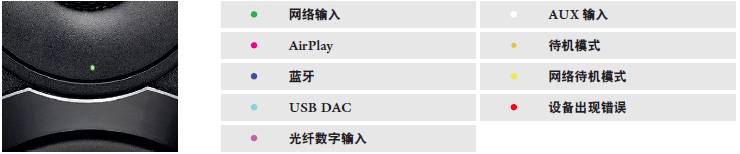 音箱正面有一个LED 指示灯,指示灯颜色根据操作状态而变化:橙色表示节能待机模式,绿色表示网络功能,粉色表示AirPlay,天蓝色表示USB DAC;因此,非常容易确认当前选择的音乐源。