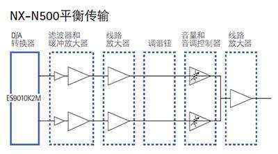 NX-N500 的D/A 转换器是ESS Technology 公司出品的ES9010K2M,它不仅能非常精确地处理32 位音频,而且能够处理大量音频数据,全面支持PCM 384kHz,DSD 5.6MHz 真实再现,低音区力度十足,高音区分辨率高。由于内置的D/A 转换器会产生自身的主时钟脉冲,转换器中也包含了的消抖功能,能在小的时钟抖动影响下实现D/A 转换。