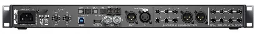 Fireface UFX III背后则有8个平衡模拟线路输入和8个平衡模拟线路输出,以及一对XLR卡侬主监听输出接口。而数字接口方面则包括有2个ADAT光纤输入和输出接口(也可作为单独的光纤SPDIF接口使用)、1个AES/EUB输入和输出接口,第二对的MIDI输入和输出接口,以及一个光纤MADI输入和输出接口可同时双向传输64个通道。另外还有BNC的字时钟输入和输出接口,同轴MADI输入和输出接口可作为额外的备份来用。