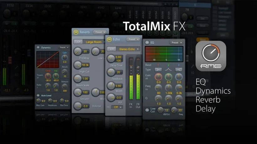 Fireface UFX III内置强大的DSP算力,不仅可用于TotalMix FX的软件混音台的零延迟监听、通道通路设置、创建无限多的子混音总线,也可驱动内置的效果器。包括每个输入和输出通道都有的通道效果器(均衡、动态、混响发送和延迟发送),也可支持类似Loopback内录功能。